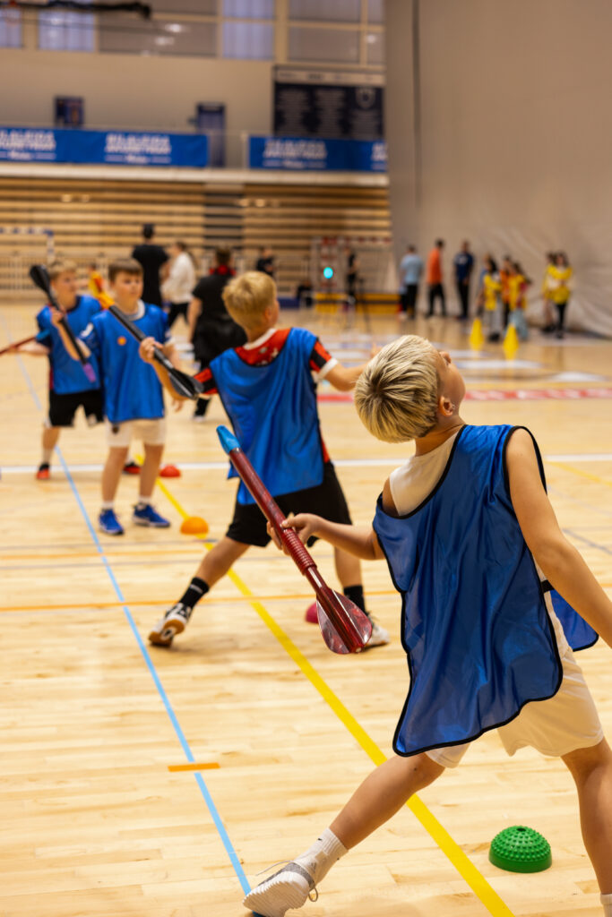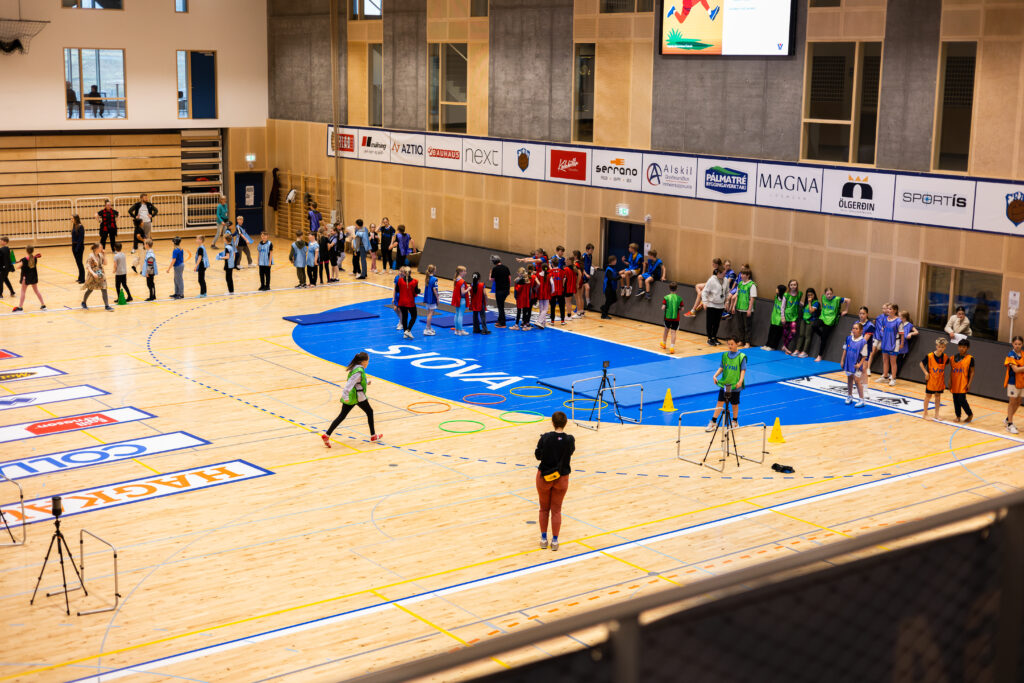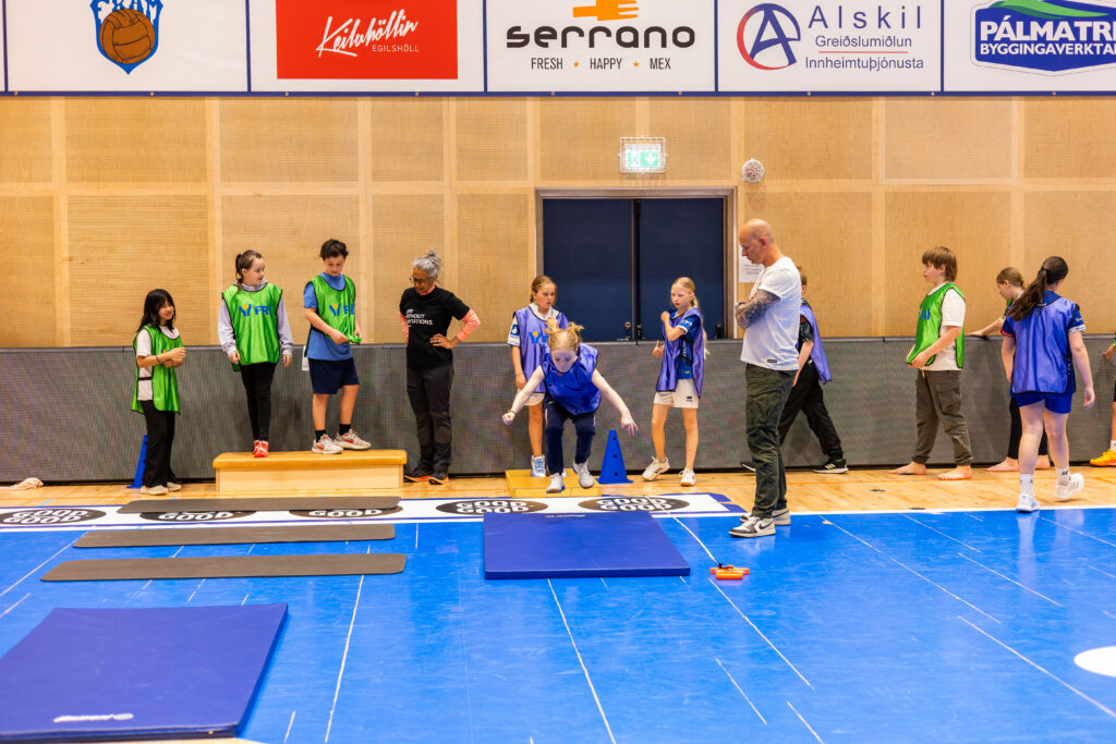 Eftir nokkrar umferðir af boðhlaupi var komin mikil stemming í hópinn og krakkarnir spenntir fyrir næsta hluta sem var stöðvaþjálfun þar sem þau fengu tækifæri til að prófa nokkrar frjálsíþróttagreinar í gegnum skemmtilegar og fjölbreyttar stöðvar. Í gær fengu krakkarnir að prófa spretthlaup, grindahlaup, langstökk, þrístökk, langstökk og þrístökk án atrennu og skulukast. Þar sem eitt af markmiðum dagsins er að sýna fjölbreytni frjálsíþróttanna þótti mikilvægt að hafa fjölbreyttar greinar í boði.