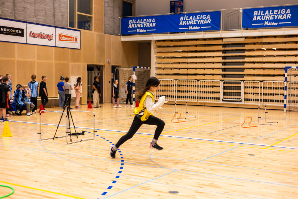 Þau byrjuðu á að spreyta sig í boðhlaupi þar sem hörkukeppni var á milli liðanna átta sem krakkarnir mynduðu og þótti krökkunum það gaman í boðhlaupinu að þau báðu um að hlaupa nokkrar umferðir, og að sjálfsgögðu var orðið við því. Það var alveg augljóst að þarna voru miklir hlauparar á ferð, og ekki síður mikið keppnisfólk.
